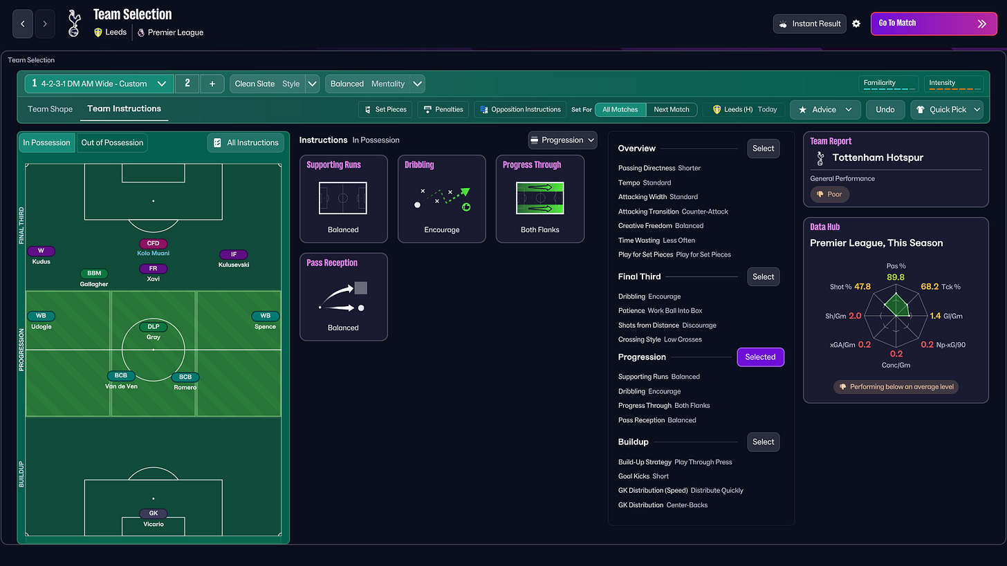 Next came a crucial match against 15th-place Leeds United. With Porro suspended, we brought in Djed Spence and made a small attacking tweak, initially focusing play down the wings to exploit Leeds’ shape with an inverted fullback on the left and a pressing fullback on the right.