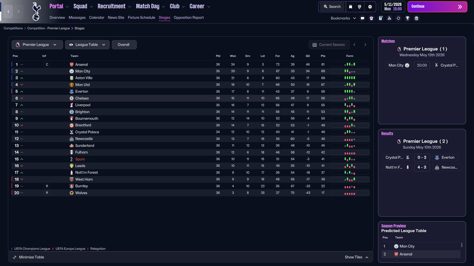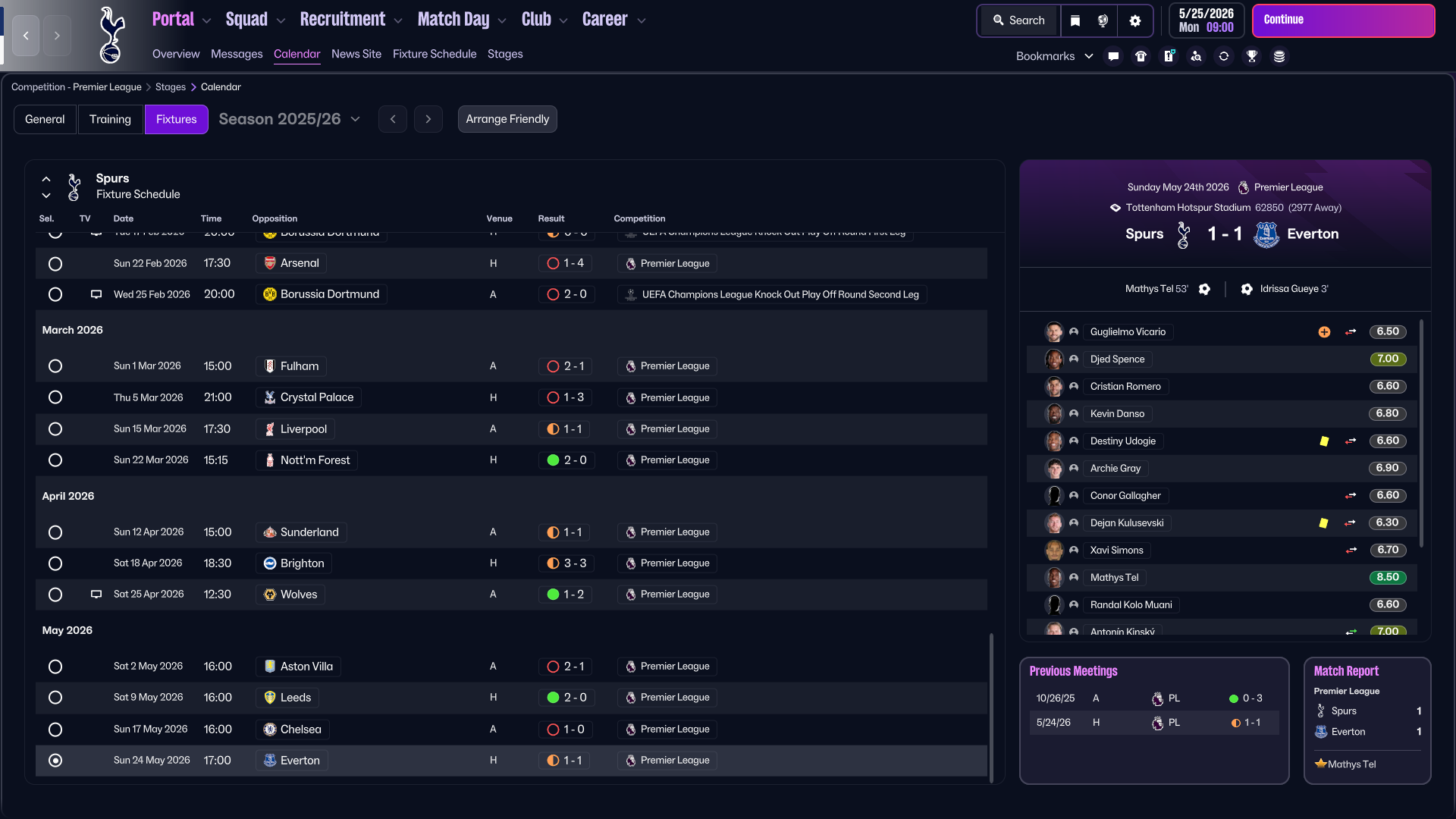 The game ended 1–1. Slight frustration, but overall a positive performance against a very good Everton side that finished 5th in this simulation. With this draw actually costing them direct Champions League qualification.