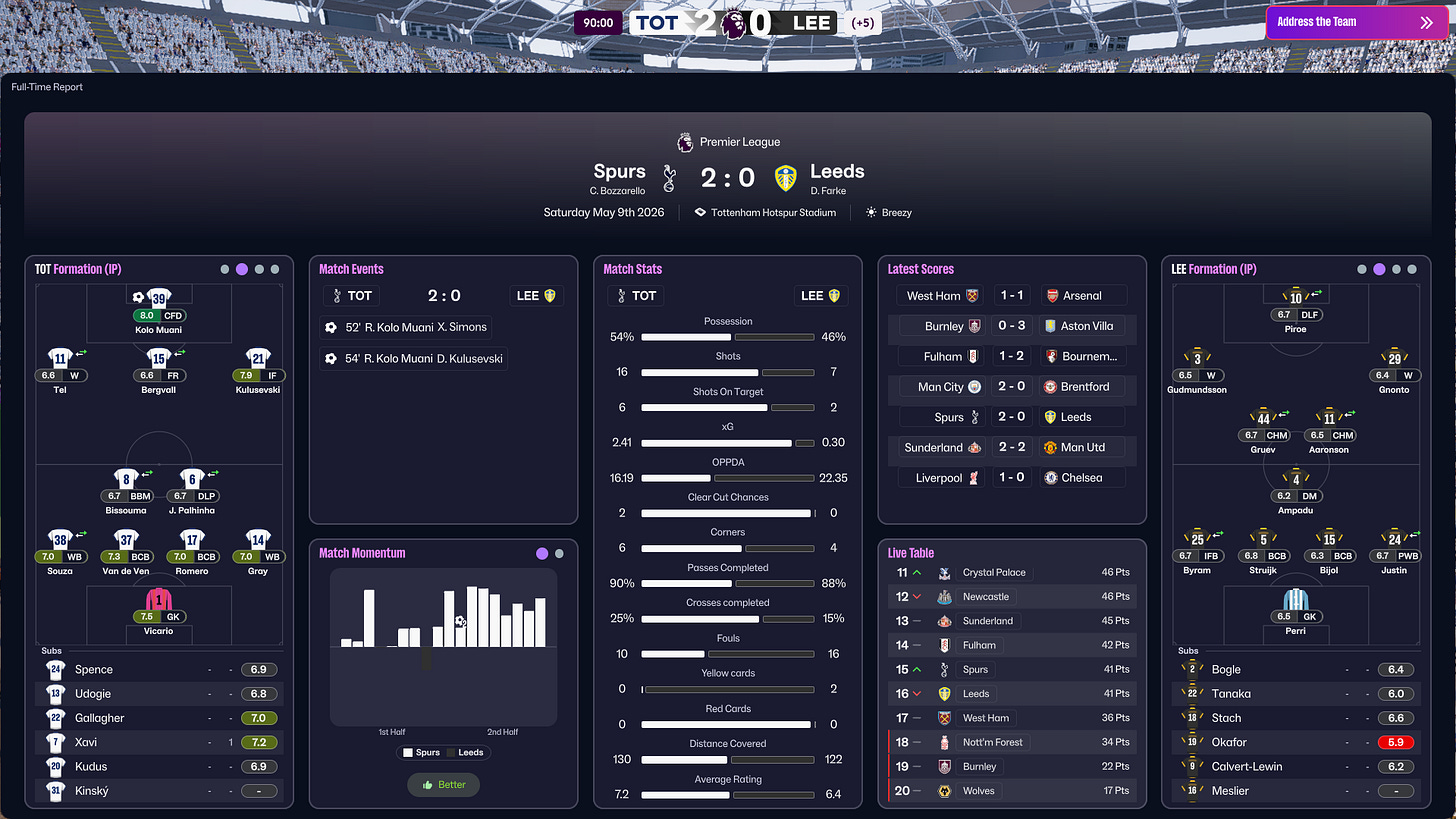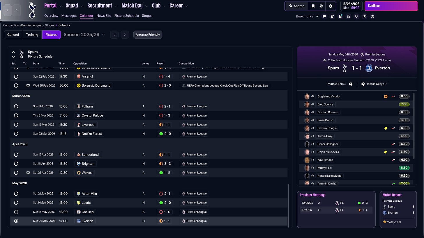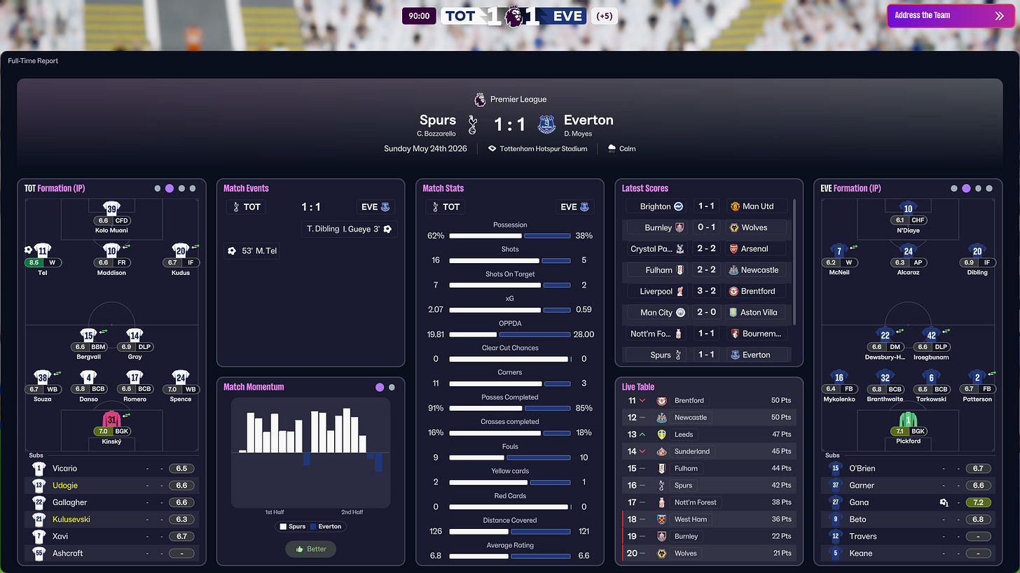 This experiment doesn’t prove that these exact choices would “fix” Tottenham in real life. But some patterns felt familiar. The players who performed, the recurring defensive errors, and the difficulty in controlling games all reflected real issues.