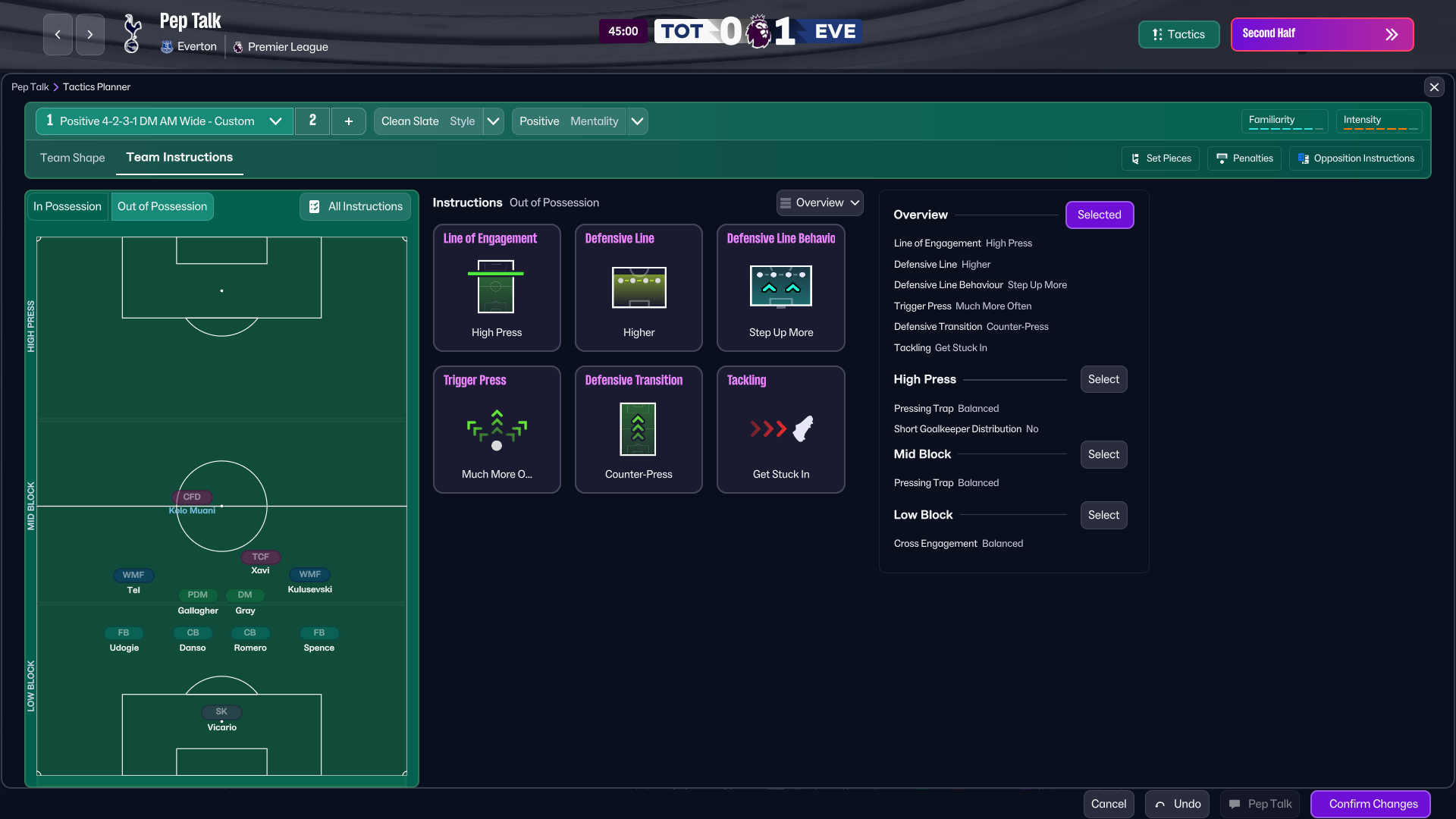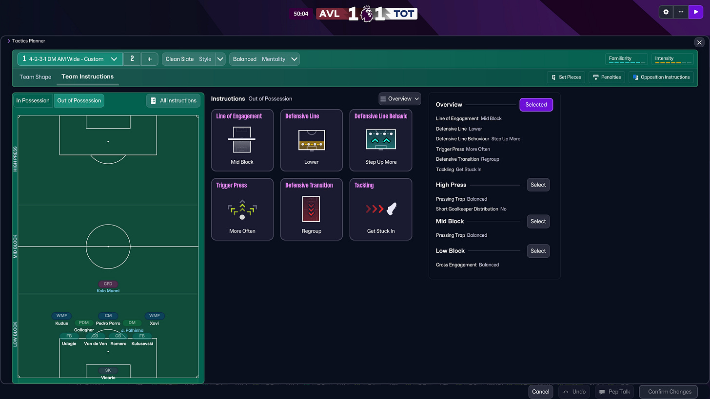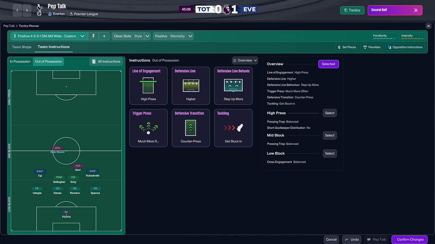 At half-time, we increased intensity. We pushed into a more aggressive 4-4-2 pressing shape, utilising Xavi as a secondary striker, raising the defensive line and committing more bodies forward.