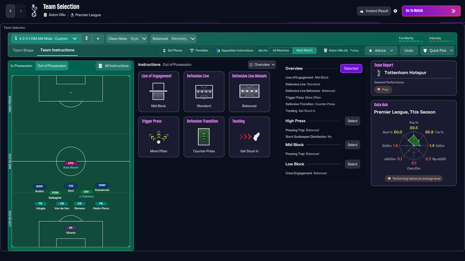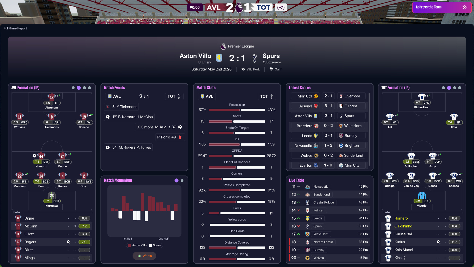 The start was encouraging, Pedro Porro hit the bar early, but the game quickly turned chaotic. Palhinha himself conceded a penalty, our third in as many matches, but once again Guglielmo Vicario bailed us out. Still, the warning signs were clear. Sitting deeper limited Villa’s access to the box, but allowed too many shots from the edge, and eventually they took the lead with Kamara.