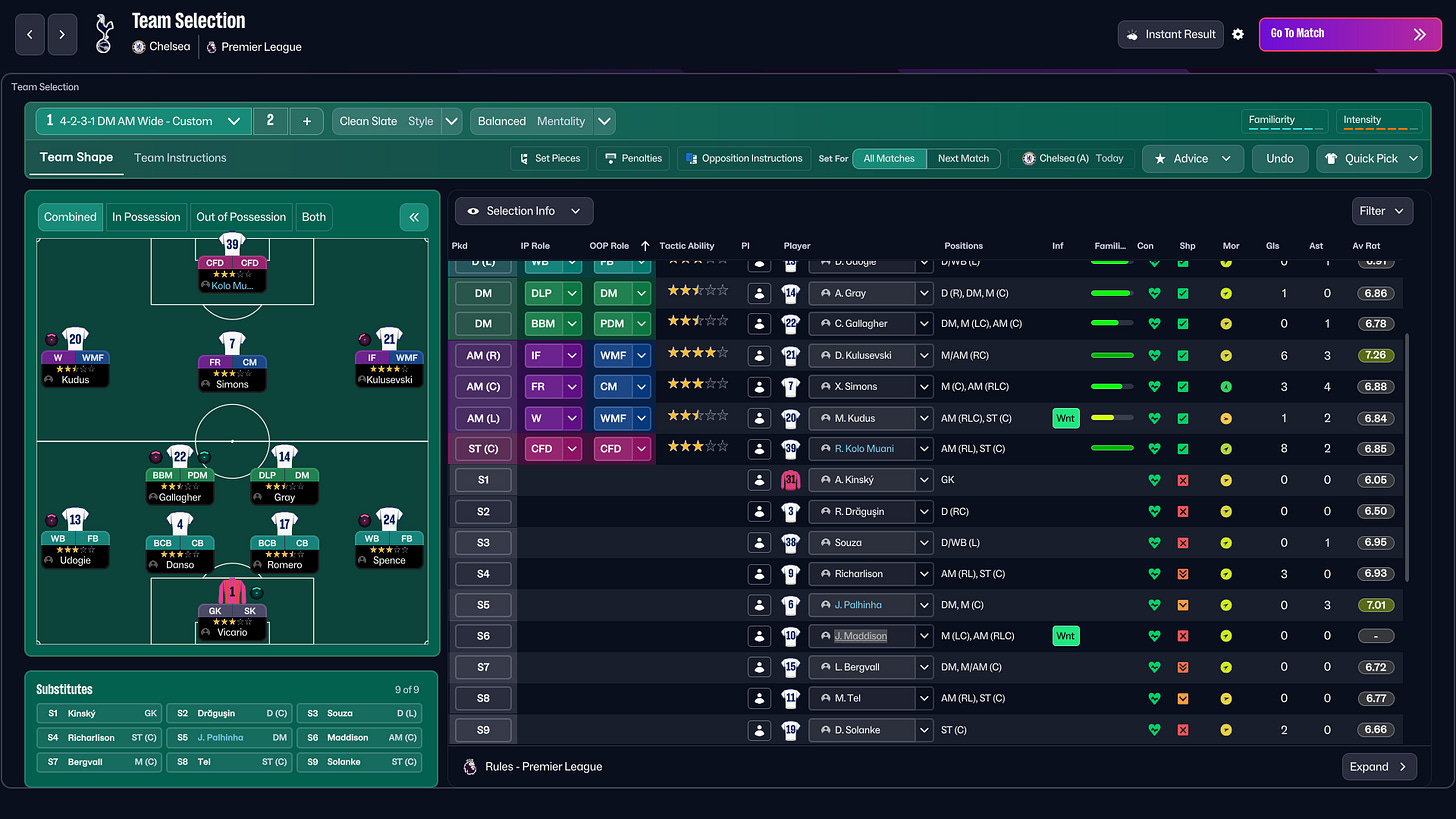 The match showed the limits of the system against top opposition. A turnover in midfield led to a goal from Cole Palmer, and from there we struggled to create. We tried shifting to two strikers, even pushing Gallagher higher in a 4-1-3-2, but nothing really worked. Too few chances, too little control.